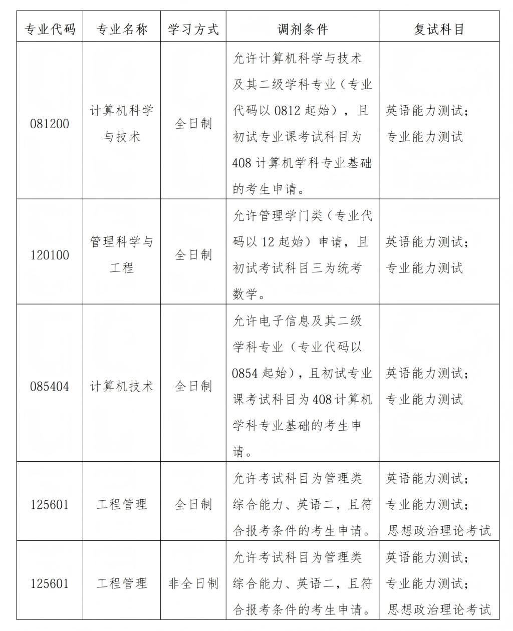 (代码11832)计算机科学与技术(081200)、管理科学与工程硕士(120100)、计算机技术(085404)、工程管理硕士(125601)目前有部分调剂名额,欢迎广大考生积极调剂报考。